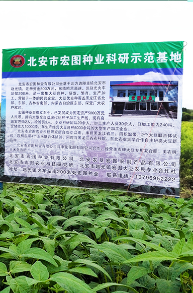 北安市宏圖種業有限公司是一家及大豆育種研發、生產加工、銷售于一體的種業企業 ,成立于2010年6月24日。公司坐落在北方邊陲重鎮北安市趙光鎮,公司擁有趙光農場、紅星農場、建設農場等多家良種繁育基地。得天獨厚的地理優勢為繁育出優質的大豆種子提供了便利的條件。